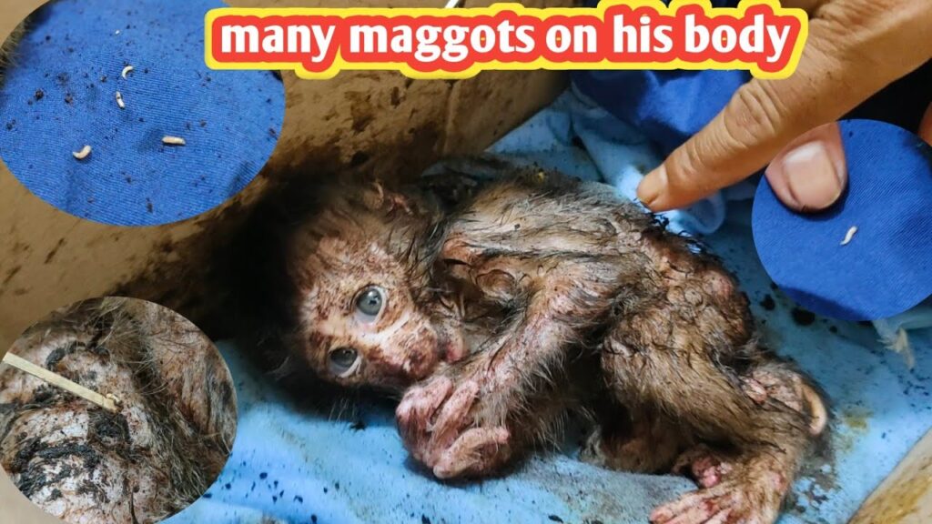 In a tragic but ultimately hopeful rescue, several newborn baby monkeys were found abandoned and in horrific condition at an illegal roadside animal trading post. Barely clinging to life, the infants—some born just days earlier—were discovered huddled together in a filthy cage, their tiny bodies covered in dirt, waste, and crawling with maggots.