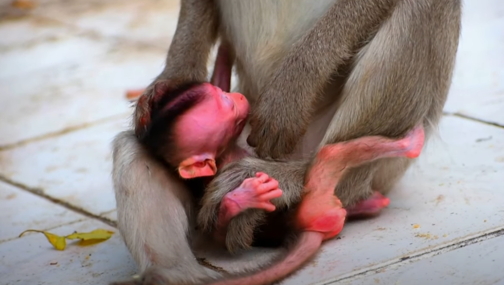 Baby Balu, a newborn monkey, had been feeding eagerly from his mother since the day he was born. His tiny hands grasped her fur, and his soft lips suckled the milk that nourished him. However, today was different. Balu, despite being hungry, was too tired to continue feeding. His little body, worn out from the excitement of his first few days in the world, seemed to be asking for rest instead of food.
